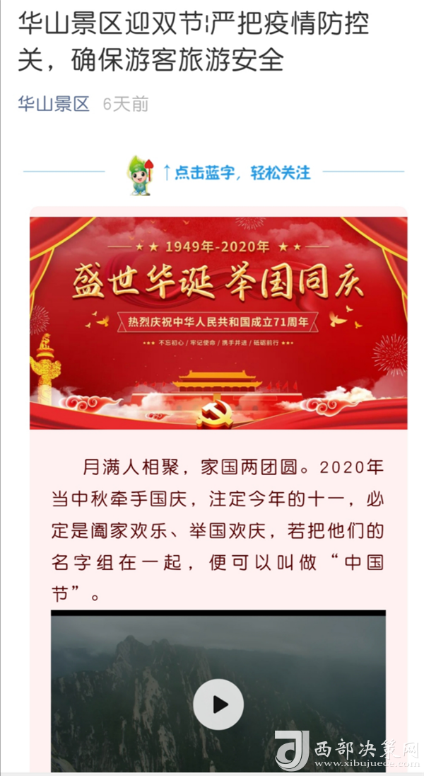 9月30日至10月8日期間,景區(qū)官方微信以歡度雙節(jié)、防疫安全、熱心服務(wù)、旅游攻略等為主題發(fā)布宣傳軟文23篇,累計(jì)閱讀量4.2萬人次,分享及轉(zhuǎn)發(fā)量共計(jì)1430次;官方微博向游客及時(shí)發(fā)布景區(qū)天氣、客流、景色實(shí)況、溫馨提示等景區(qū)度節(jié)綜合信息共計(jì)102條,閱讀量高達(dá)101.9萬次,并耐心、細(xì)致解答網(wǎng)友私信、評(píng)論共計(jì)532條;通過抖音平臺(tái)發(fā)布景區(qū)公告、秋日美景、好人好事等短視頻及圖片錦集共計(jì)18條,播放量共計(jì) 1.4萬次。