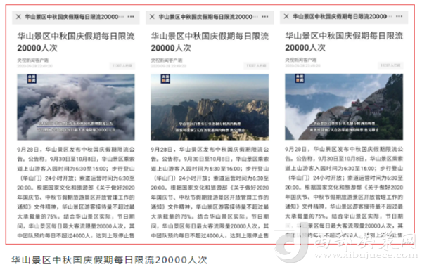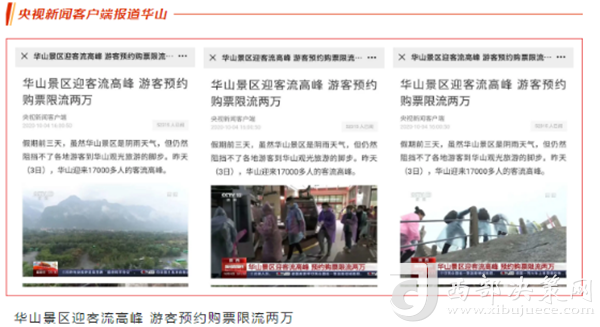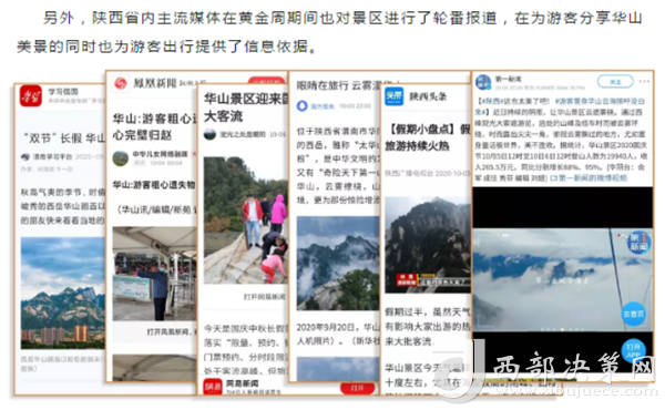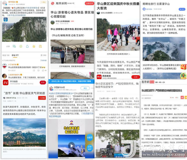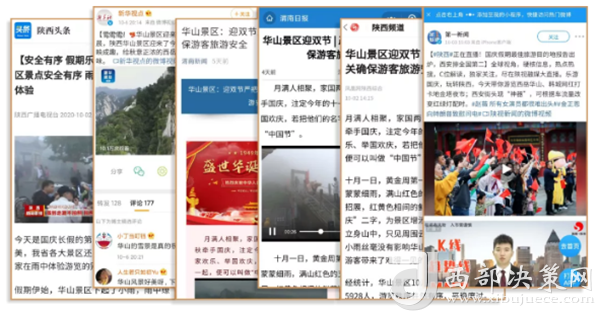 度節(jié)期間,通過央視cctv2【天下財(cái)經(jīng)】、cctv4、cctv13【新聞30分】、cctv13【新聞直播間】、央視網(wǎng)【國慶假期·出游】、央視網(wǎng)學(xué)習(xí)強(qiáng)國、央視新聞客戶端、新華社等國家級(jí)媒體對(duì)景區(qū)度節(jié)工作、游覽秩序、特色服務(wù)等方面進(jìn)行轟炸式報(bào)道;聯(lián)合陜西日?qǐng)?bào)、陜西電視臺(tái)、渭南日?qǐng)?bào)、渭南電視臺(tái)、三秦都市報(bào)、陜西旅游資訊、騰訊網(wǎng)、新浪網(wǎng)、網(wǎng)易陜西、鳳凰陜西等30余家主流媒體對(duì)景區(qū)度節(jié)期間各項(xiàng)工作及實(shí)時(shí)風(fēng)景進(jìn)行跟蹤報(bào)道,共計(jì)發(fā)布各類宣傳稿件239篇,全面提升景區(qū)旅游熱度。