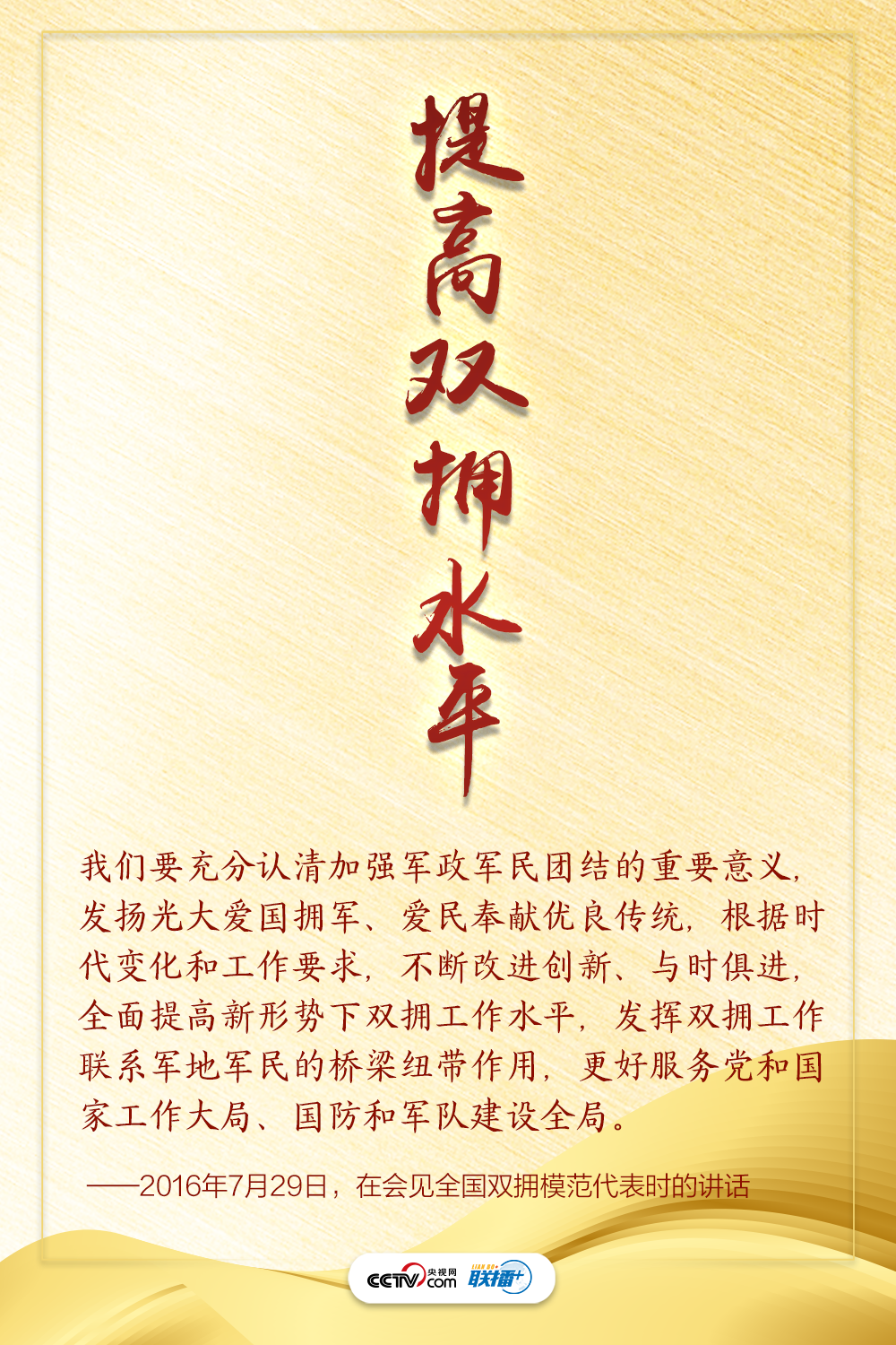 習近平總書記始終高度重視雙擁工作,多次在重要會議、國內考察時親力親為指導推動。他強調擁軍優(yōu)屬、擁政愛民是我黨我軍特有的政治優(yōu)勢,堅如磐石的軍政軍民關系是我們戰(zhàn)勝一切艱難險阻、不斷從勝利走向勝利的重要法寶。