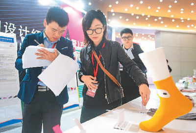 日前,中國設計紅星獎(諸暨)產(chǎn)品設計大賽在浙江省諸暨市開啟現(xiàn)場實物評審。為推動襪業(yè)“設計+科技”的創(chuàng)新,今年的主題聚焦襪業(yè),共有387件擁有外觀設計專利的作品入圍實物終評。江 漢攝(新華社發(fā))