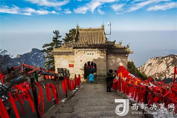 金鎖關(guān)是建在三峰口的一座城樓般石拱門,是經(jīng)五云峰通往東西南峰的咽喉要道,鎖關(guān)后則無路可通。杜甫《望岳》詩中“箭栝通天有一門”就是指的這里。道家認(rèn)為,華岳為仙鄉(xiāng)神府,只有過了通天門,才算進(jìn)入仙境。所以有“過了金鎖關(guān),另是一重天的”的民謠。