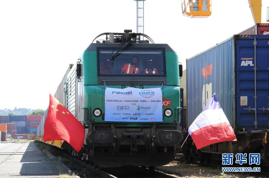 6月23日,滿載防疫物資的中歐班列抵達法國巴黎東南郊的瓦朗通,此次班列是中法首趟抗疫物資專列。新華社記者 徐永春 攝