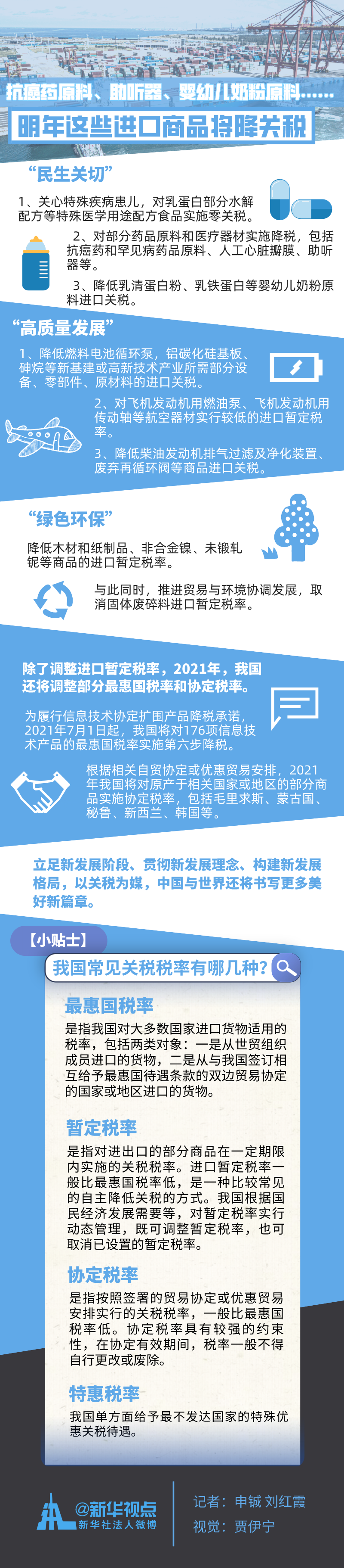 每逢年末,我國都會根據(jù)經(jīng)濟社會發(fā)展情況對新一年的部分商品的關(guān)稅稅率進行調(diào)整。國務(wù)院關(guān)稅稅則委員會23日印發(fā)2021年關(guān)稅調(diào)整方案,決定從明年1月1日開始,對883項商品實施低于最惠國稅率的進口暫定稅率,抗癌藥原料、助聽器、嬰幼兒奶粉原料等跟百姓生活密切相關(guān)的商品均在其中。同時,隨著中國對外開放持續(xù)擴大,部分協(xié)定稅率、最惠國稅率也將在明年降低。(記者申鋮、劉紅霞)