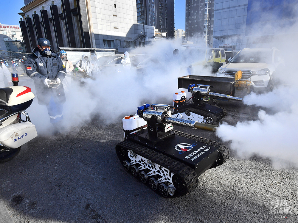 △1月9日,北京岳各莊市場,2臺“坦克”防疫消殺機器人對市場進行消殺。這種消殺“新裝備”裝有大容量藥壺,每小時消殺約10000平方米。