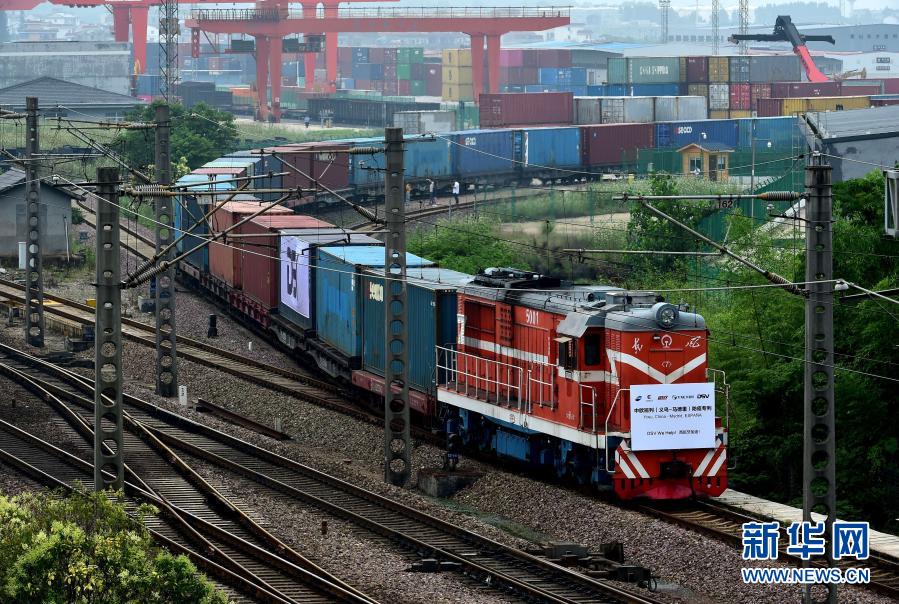 這是2020年6月5日,滿載防疫物資的“義新歐”中歐班列(義烏-馬德里)在義烏西站啟程,前往西班牙首都馬德里。新華社發(fā)(呂斌 攝)