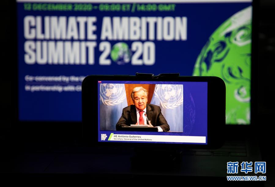 這是2020年12月12日在美國紐約拍攝的聯(lián)合國秘書長古特雷斯在氣候雄心峰會上通過視頻發(fā)表講話的屏幕畫面。氣候雄心峰會由聯(lián)合國及有關(guān)國家倡議舉辦,旨在紀(jì)念《巴黎協(xié)定》達(dá)成五周年,進(jìn)一步動員國際社會強化氣候行動,推進(jìn)多邊進(jìn)程。新華社記者 王迎 攝