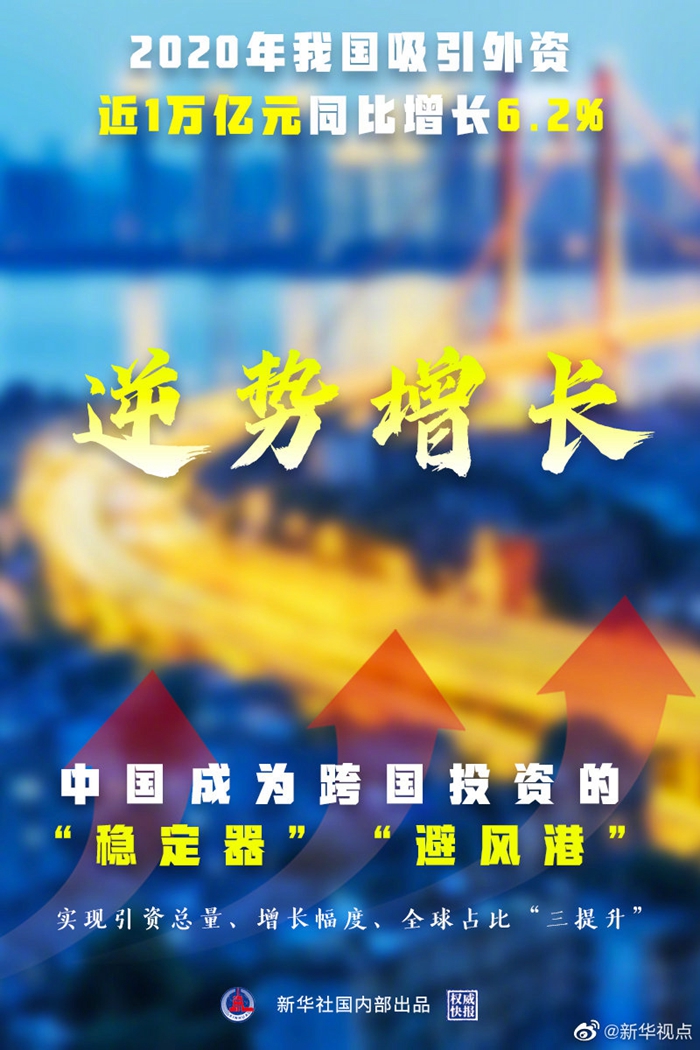 原標(biāo)題:權(quán)威快報|逆勢創(chuàng)新高!2020我國吸收外資近1萬億元,同比增長6.2% 新冠肺炎疫情沖擊下,全球跨國投資大幅下降,中國引資卻逆勢增長。商務(wù)部1月20日發(fā)布數(shù)據(jù)顯示,2020年我國非金融領(lǐng)域?qū)嶋H使用外資9999.8億元人民幣,同比增長6.2%,實現(xiàn)了引資總量、增長幅度、全球占比“三提升”。中國成為跨國投資的“穩(wěn)定器”和“避風(fēng)港”。(記者于佳欣)