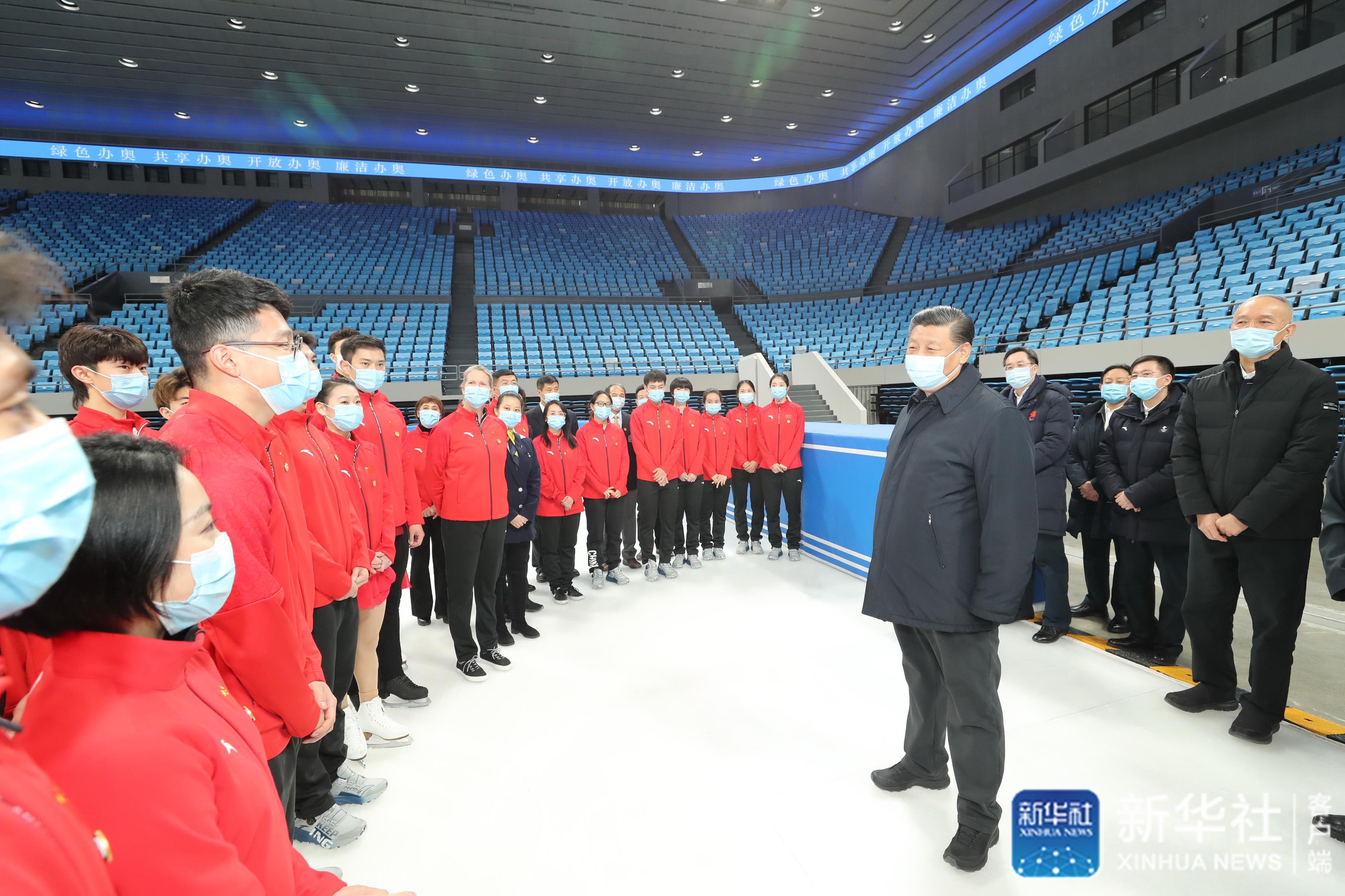 ↑1月18日至20日,中共中央總書(shū)記、國(guó)家主席、中央軍委主席習(xí)近平在北京、河北考察,并主持召開(kāi)北京2022年冬奧會(huì)和冬殘奧會(huì)籌辦工作匯報(bào)會(huì)。這是18日上午,習(xí)近平在位于北京市海淀區(qū)的首都體育館,同國(guó)家花樣滑冰隊(duì)和短道速滑隊(duì)運(yùn)動(dòng)員、教練員等親切交流。新華社記者 鞠鵬 攝