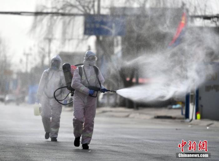 1月15日,石家莊消防救援支隊(duì)藁城大隊(duì)消防員在小果莊村村口路段消殺。當(dāng)日,河北省石家莊市藁城區(qū)開展防疫消殺工作。 中新社記者 翟羽佳 攝