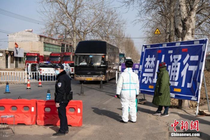 圖為距離增村鎮(zhèn)約4公里、距離小果莊村約8公里的一處疫情防控檢查點(diǎn),運(yùn)送異地集中隔離觀察人員的車輛通過此地。 中新社記者 侯宇 攝