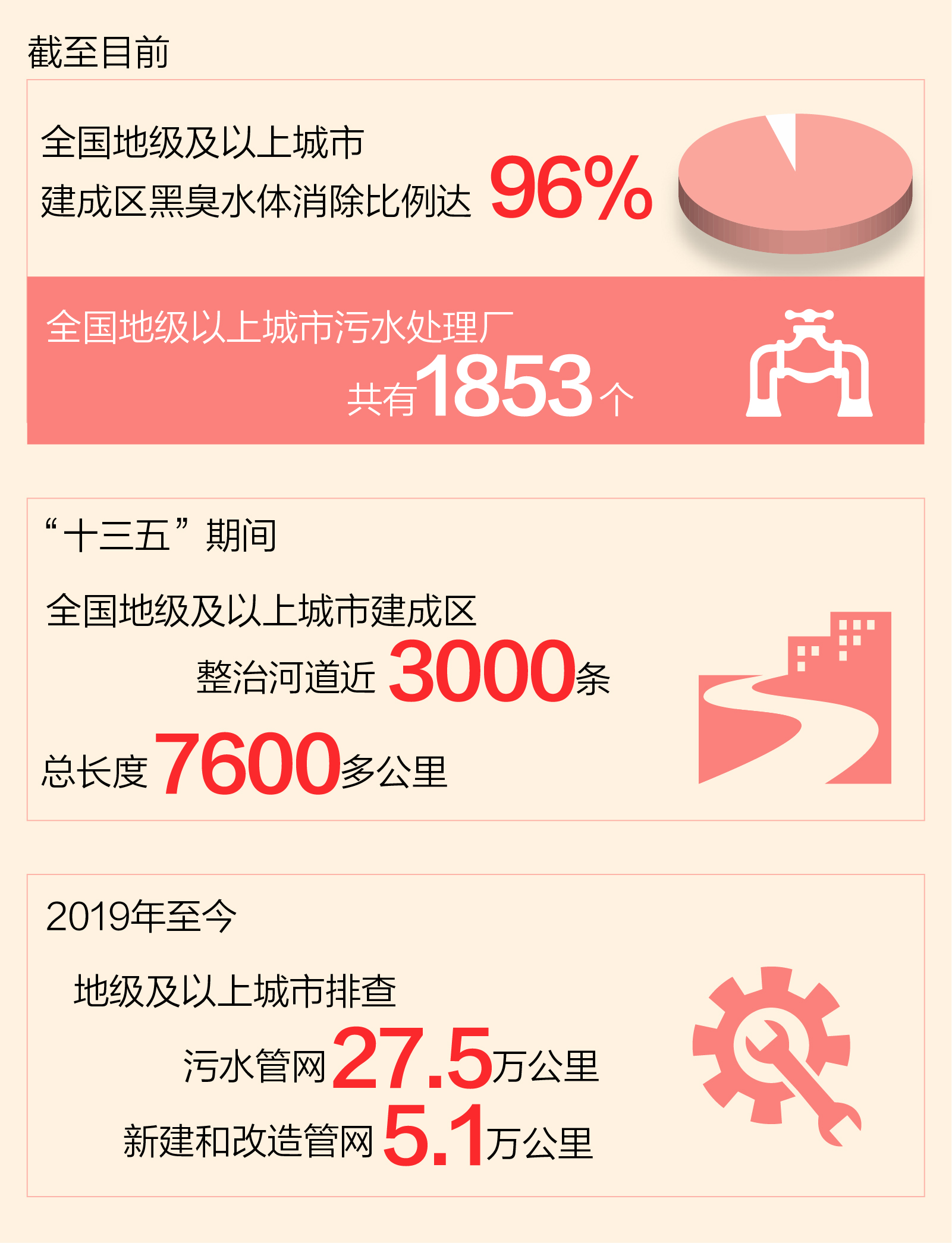 “十三五”期間,全國地級及以上城市建成區(qū)整治河道近3000條,總長度7600多公里。截至目前,全國地級及以上城市建成區(qū)黑臭水體消除比例達96%。2019年至今,全國地級及以上城市排查污水管網(wǎng)27.5萬公里,新建和改造管網(wǎng)5.1萬公里。
