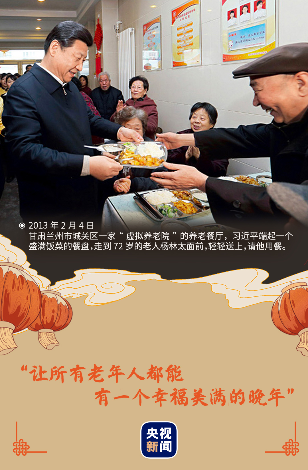 2013年春節(jié)前夕,習(xí)近平總書記來到城關(guān)區(qū)的一家“虛擬養(yǎng)老院”養(yǎng)老餐廳,詳細(xì)了解“虛擬養(yǎng)老院”的運行情況,向老人們拜年。
