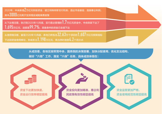 今年3月初,財(cái)政部調(diào)研小組發(fā)布的《2020年中國(guó)財(cái)政政策執(zhí)行情況報(bào)告》顯示,直達(dá)資金執(zhí)行情況總體良好,“僅用20天時(shí)間,就將95%的中央直達(dá)資金下達(dá)市縣基層,省級(jí)財(cái)政細(xì)化下達(dá)時(shí)間平均只有1周,速度前所未有。”“目前,財(cái)政直達(dá)資金預(yù)算下達(dá)已經(jīng)完成,其中1.56萬(wàn)億元資金已經(jīng)投入使用,預(yù)算執(zhí)行情況總體良好,重點(diǎn)領(lǐng)域支出保障有力,效果明顯。”