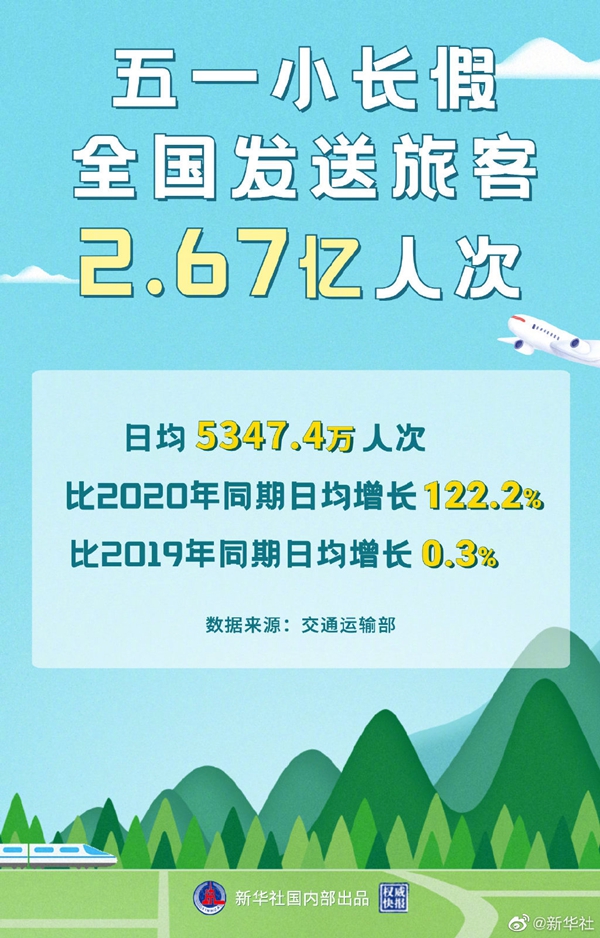 記者5日從交通運輸部獲悉,“五一”假期,全國鐵路、公路、水路和民航預(yù)計共發(fā)送旅客2.67億人次,日均5347.4萬人次,比去年同期日均增長122.2%。