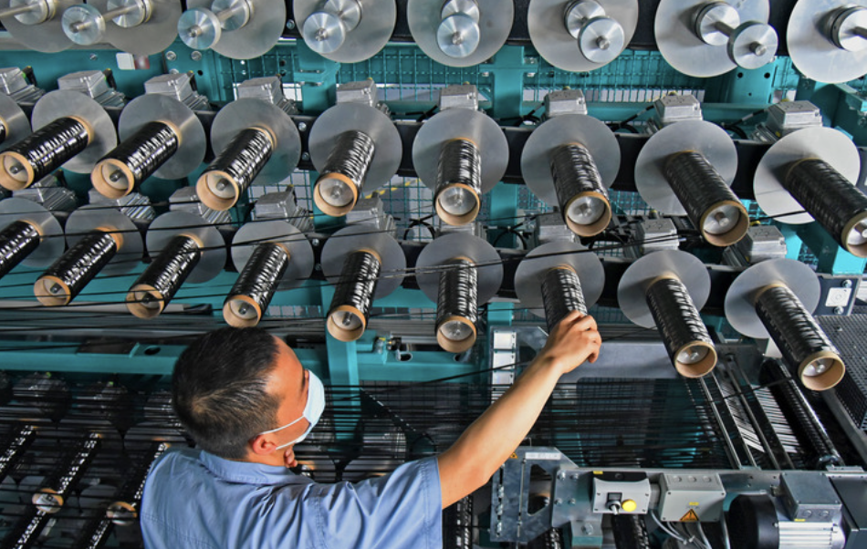 在江蘇連云港經(jīng)濟(jì)技術(shù)開(kāi)發(fā)區(qū),工人在查看碳纖維生產(chǎn)線運(yùn)行情況。新華社發(fā)(耿玉和 攝)