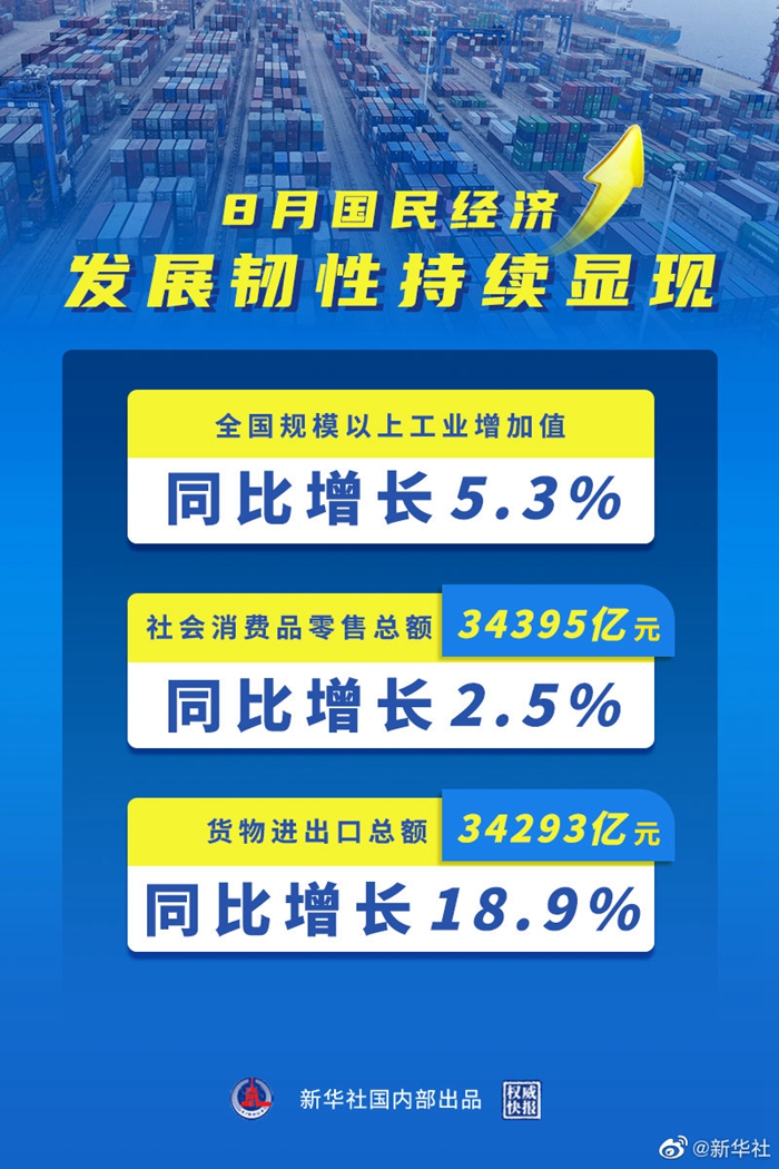 國(guó)家統(tǒng)計(jì)局15日發(fā)布的數(shù)據(jù)顯示,8月份,全國(guó)規(guī)模以上工業(yè)增加值同比增長(zhǎng)5.3%,兩年平均增長(zhǎng)5.4%;社會(huì)消費(fèi)品零售總額34395億元,同比增長(zhǎng)2.5%,兩年平均增長(zhǎng)1.5%;貨物進(jìn)出口總額34293億元,同比增長(zhǎng)18.9%,國(guó)民經(jīng)濟(jì)發(fā)展韌性持續(xù)顯現(xiàn)。(記者魏玉坤、謝?,帲?/p>