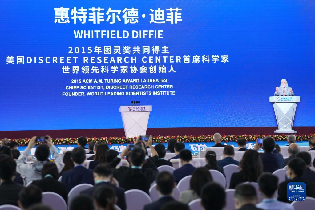 2015年圖靈獎(jiǎng)共同得主惠特菲爾德·迪菲在2021中關(guān)村論壇全體會(huì)議上視頻致辭(9月25日攝)。新華社記者 鞠煥宗 攝