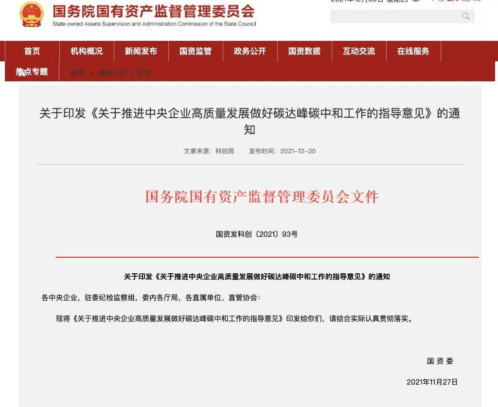 國務(wù)院國資委30日對(duì)外發(fā)布《關(guān)于推進(jìn)中央企業(yè)高質(zhì)量發(fā)展做好碳達(dá)峰碳中和工作的指導(dǎo)意見》,明確了中央企業(yè)做好碳達(dá)峰碳中和工作的總體要求與主要目標(biāo)。