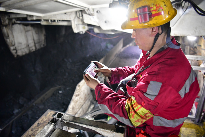在曹家灘智慧礦山智能化工作面內(nèi),綜采二隊機電副隊長蔡進通過操作手機控制生產(chǎn)設(shè)備。新華社記者邵瑞 攝