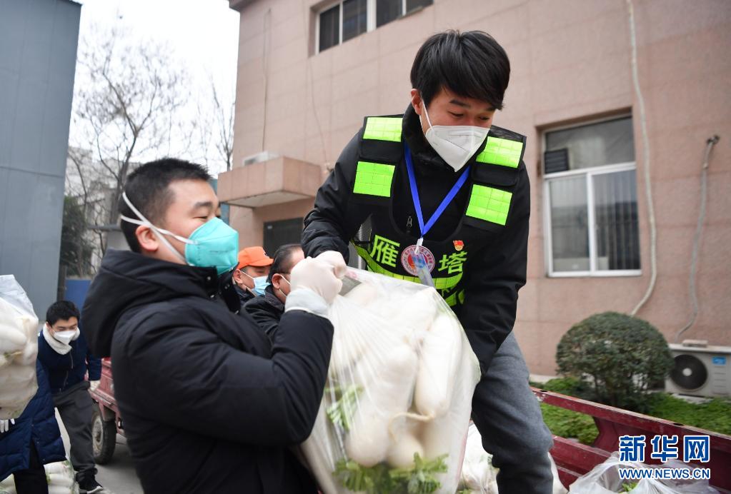 退役軍人志愿突擊隊隊員侯磊(右)協(xié)助社區(qū)工作人員搬運物資。新華社記者 張博文 攝