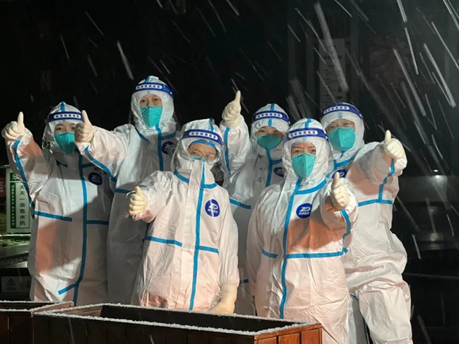 西安大興醫(yī)院的醫(yī)護人員在風(fēng)雪中加油打氣。西安大興醫(yī)院供圖