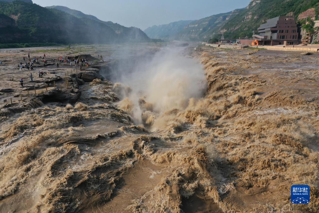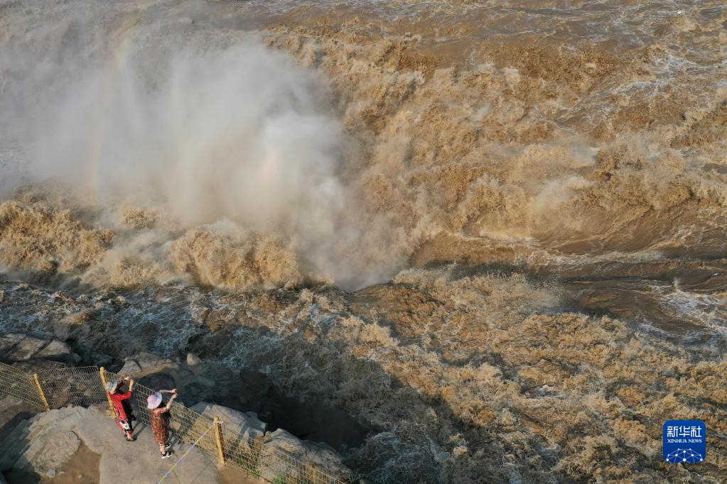 7月4日,游客在黃河壺口瀑布景區(qū)觀瀑(無人機照片)。新華社發(fā)(呂桂明攝)