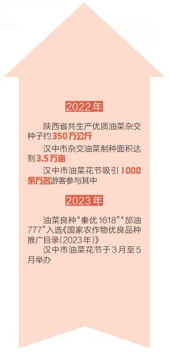 陜西是雜交油菜種業(yè)強(qiáng)省,雜交油菜育種研究和產(chǎn)業(yè)化開發(fā)一直走在全國前列。2022年,陜西省制定《油菜產(chǎn)業(yè)綠色革命科技三年行動(dòng)實(shí)施方案》,取得明顯成效。陜西省去年全年共生產(chǎn)優(yōu)質(zhì)油菜雜交種子約350萬公斤。勉縣、城固縣、洋縣入選全國油菜產(chǎn)業(yè)綠色革命科技示范縣;陜西農(nóng)業(yè)科研單位培育的油菜良種“秦優(yōu)1618”“邡油777”入選2022年國家糧油生產(chǎn)主導(dǎo)品種和《國家農(nóng)作物優(yōu)良品種推廣目錄(2023年)》;漢中市農(nóng)業(yè)農(nóng)村局啟動(dòng)糧油“百千萬”豐產(chǎn)示范工程,在全市11個(gè)縣(區(qū))建立油菜優(yōu)良品種和綠色高產(chǎn)高效生產(chǎn)技術(shù)百畝示范點(diǎn)56個(gè)8100畝、千畝示范片23個(gè)2.9萬畝、萬畝示范帶9個(gè)10.5萬畝;漢中市南鄭區(qū)和勉縣被農(nóng)業(yè)農(nóng)村部認(rèn)定為國家級(jí)油菜制種大縣。漢中市委、市政府提出“最強(qiáng)產(chǎn)業(yè)、最優(yōu)種業(yè)、最美花海”的發(fā)展戰(zhàn)略,以“花”為媒,將漢中市油菜花節(jié)打造成推動(dòng)鄉(xiāng)村振興和發(fā)展文化旅游的重要載體。2022年,1000余萬名游客前來觀光旅游或參與線上活動(dòng)。“油菜經(jīng)濟(jì)”堪稱陜西的一張金色名片。