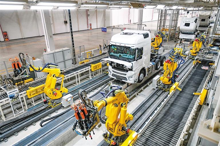陜汽重卡擴能項目總裝生產線,工業(yè)機器人正在進行自動化裝配作業(yè)。(資料照片) 記者 竇翊明 攝