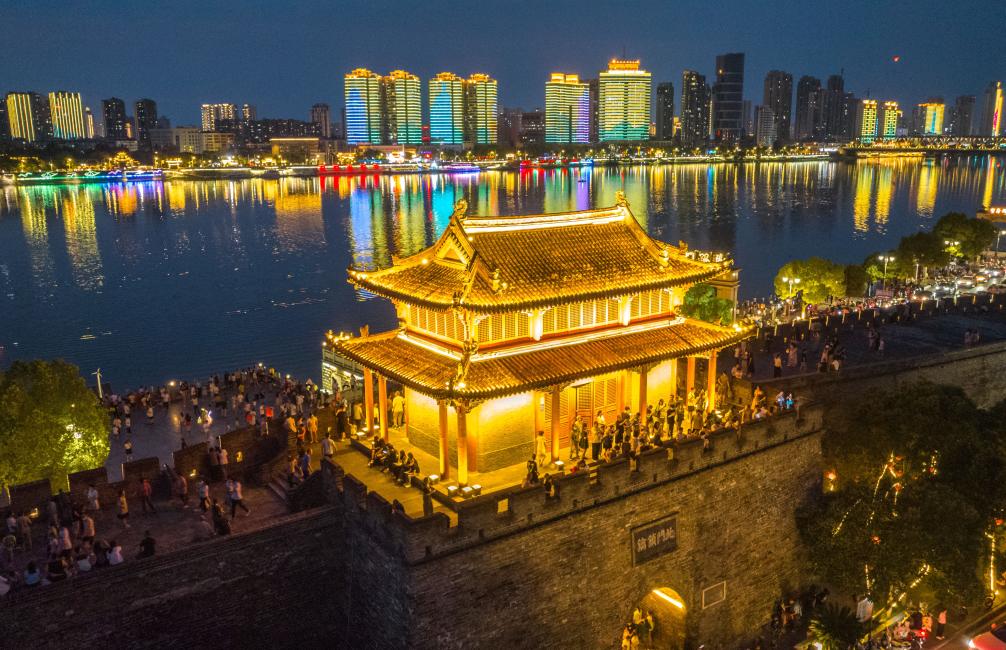 夜幕降臨,襄陽(yáng)古城燈光璀璨、游人如織。(楊東 攝)