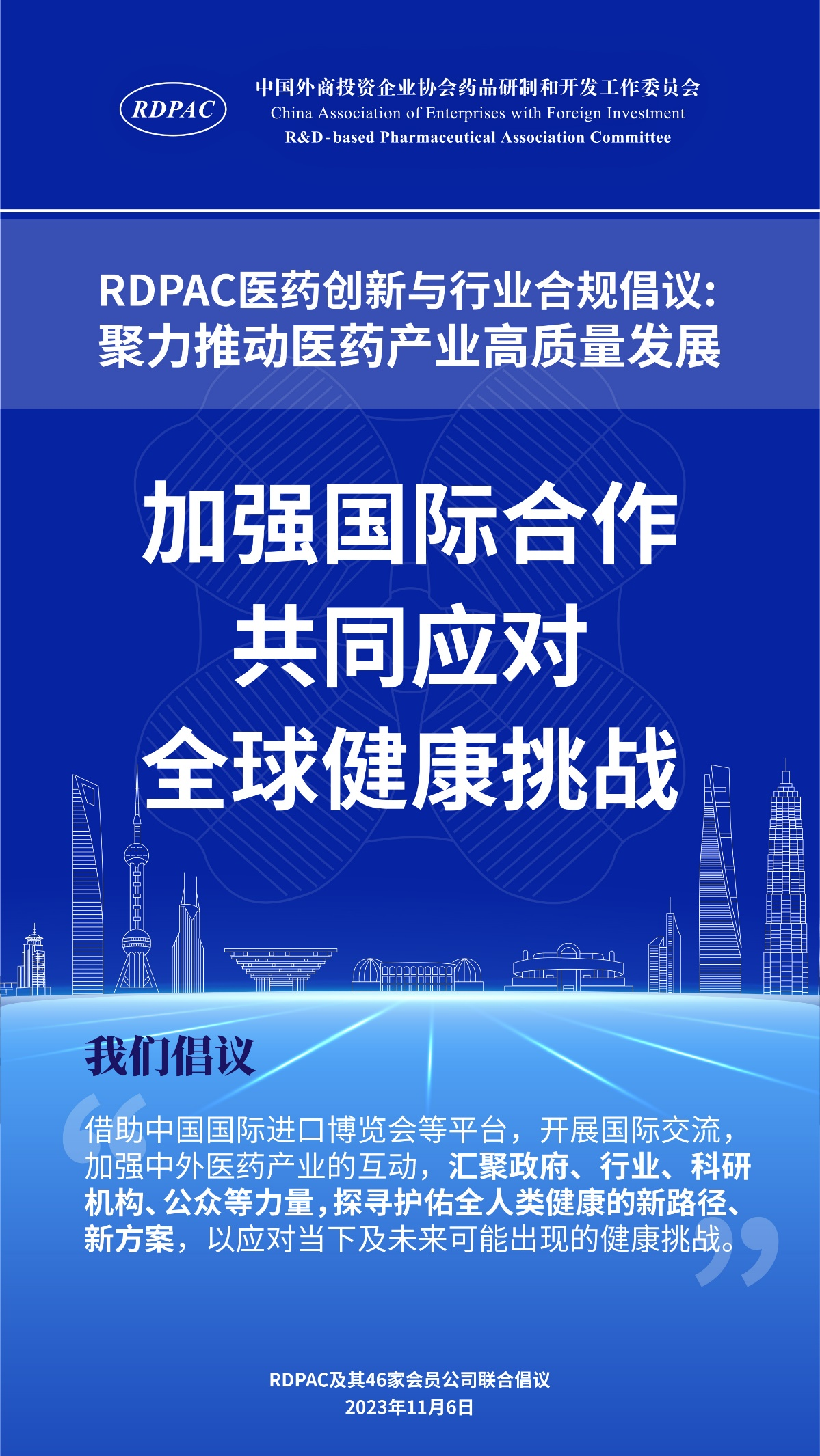 11月6日,中國外商投資企業(yè)協(xié)會藥品研制和開發(fā)工作委員會 (以下簡稱 “RDPAC”)及其成員公司在華負責人共同發(fā)起“RDPAC醫(yī)藥創(chuàng)新與行業(yè)合規(guī)倡議”,致力于打造充滿活力的醫(yī)藥創(chuàng)新生態(tài)系統(tǒng)、完善的行業(yè)合規(guī)體系,聚力推動中國醫(yī)藥產(chǎn)業(yè)的高質(zhì)量發(fā)展,建設健康中國。