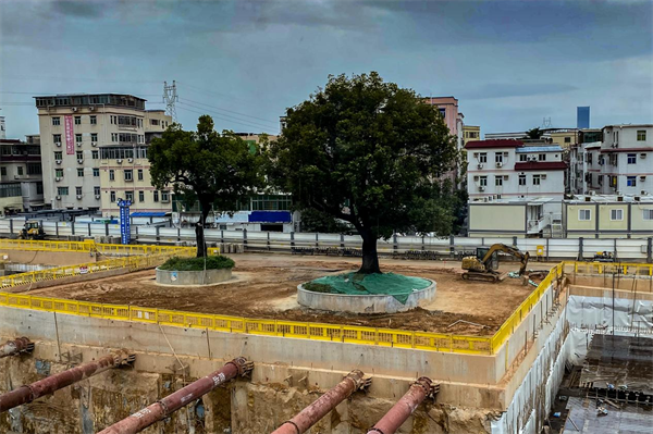 中鐵一局承擔(dān)的深(圳機(jī)場(chǎng))大(亞灣)城際鐵路白坭坑站總長(zhǎng)約540米,總建筑面積為53957平方米,為地下兩層、局部三層雙島五線車(chē)站。白坭坑站地面的2株三級(jí)古樟樹(shù),位于車(chē)站中部上方,也是規(guī)劃18號(hào)線換乘節(jié)點(diǎn)東側(cè);兩樹(shù)相距約16米,其中1株樹(shù)齡116年,高14.5米,胸圍3.3米,平均冠幅12.3米;另一株樹(shù)齡106年,高15.7米,胸圍2.2米,平均冠幅10.3米。