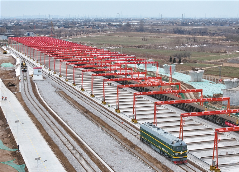 1月21日,中鐵十一局西延高鐵閻良鋪軌基地(無(wú)人機(jī)照片)。 當(dāng)日,隨著一列運(yùn)載500米長(zhǎng)鋼軌的列車駛?cè)胫需F十一局西延高鐵閻良鋪軌基地,西(安)延(安)高鐵進(jìn)入存軌施工階段,為后續(xù)鋪軌工作奠定基礎(chǔ)。項(xiàng)目建成后,西安至延安的運(yùn)行時(shí)間將從目前的2.5小時(shí)縮短至1小時(shí)左右。 新華社記者 張博文攝