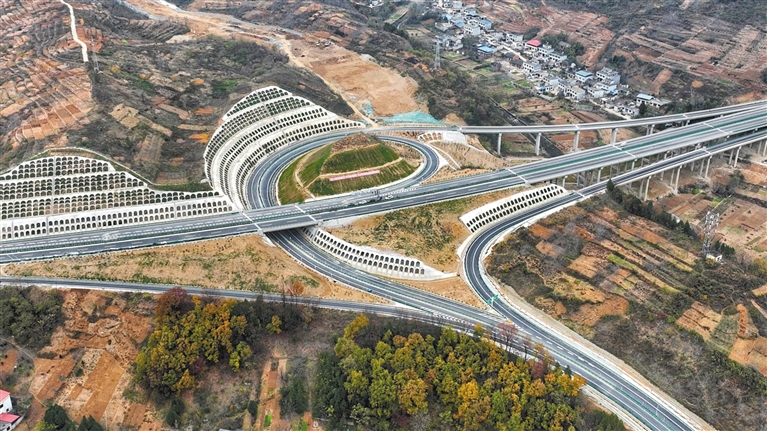 航拍的丹(鳳)寧(陜)高速公路竹林關(guān)樞紐立交(資料照片)。 記者 許奧博攝