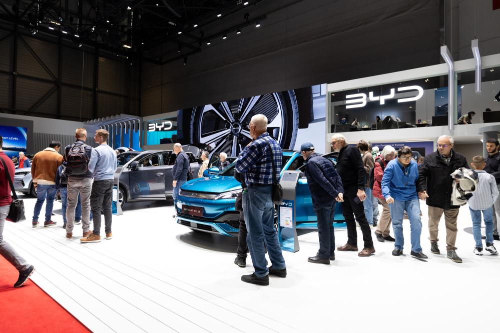 這是2月28日在瑞士日內(nèi)瓦舉行的2024年日內(nèi)瓦國(guó)際車(chē)展上拍攝的比亞迪展臺(tái)。新華社記者孟鼎博 攝
